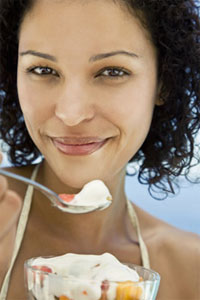 Két szelet korpás kenyér, alacsony zsírtartalmú olvasztott eidami sajt és paradicsom. Sovány joghurt, friss gyümölcs.