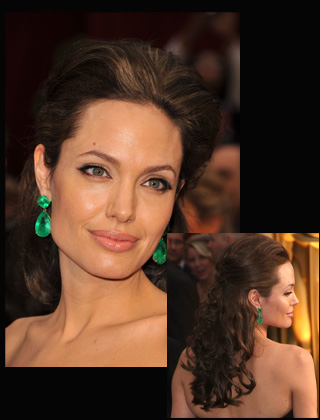 Angelina frizurája az idei év trendjét testesíti meg, legfőképpen a fejtetőn magasra emelt hajjal. Nagyszerűsége abban rejlik, hogy az elől merevre belőtt frizu, hátul lágy, nőies fürtökben végződik. Angie védjegye a szemkontúr, amitől tekintete macskás lesz, ajka viszont, semleges, natúr színben pompázik.